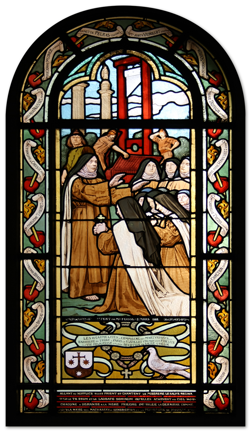 Op de dag van hun executie, 17 juli 1794, aan het einde van de bloedige en chaotische fase van de Franse Revolutie die bekendstaat als de Terreur (met hoofdletter) werden de zusters in open karren door de straten van Parijs vervoerd, waarbij ze beledigingen van de verzamelde menigte te verduren kregen. Ze lieten zich niet afschrikken en zongen het Miserere, Salve Regina en Veni Creator Spiritus terwijl ze het schavot naderden.